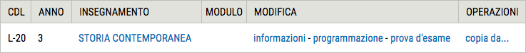 L'elenco degli insegnamenti (vedi esempio nell'immagine seguente) è costituito da 6 colonne e da tante righe quanti sono gli insegnamenti di cui si è titolari. Le righe riportano in ogni colonna: il corso di laurea, l'anno, il nome dell'insegnamento, quello dell'eventuale modulo, i link che danno accesso alle tre sezioni appena descritte e, nell'ultima colonna, il link all'operazione di copia di cui parleremo nel dettaglio più avanti.