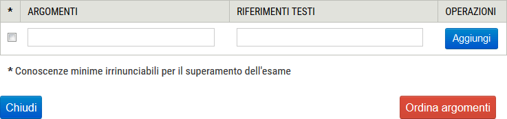 Per la compilazione di questa parte del syllabus bisogna inserire un argomento alla volta, specificando il nome e i riferimenti ai testi, indicando inoltre - attraverso la corrispondente casella di spunta, ma solo per gli insegnamenti antecedenti l'a.a. 2018/2019 - quali sono gli argomenti minimi irrinunciabili per il superamento dell'esame. Cliccare quindi sul pulsante "Aggiungi" per salvare le informazioni.